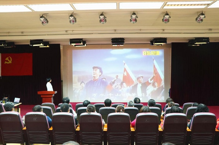 红色音乐主题党课主讲人朱胜玲讲演结合,用独特的方式将共产党的光荣历史娓娓道来。她依次为老师们带来了《开天辟地篇:国际歌火种传神州 童谣曲辗转成强音》《峥嵘岁月篇:十送红军情深似海 万里长征使命如山》《卫我河山篇:游击队敌后出奇兵 音乐家动情写战歌》《翻身解放篇:当家作主人民好欢喜 天明日朗山河开新篇》《旭日东升篇:改天换地歌声嘹亮 跨山越水图画壮美》《全新天地篇:立精神丰碑映照时代 唱动听山歌深情感恩》《春风浩荡篇:喜雨润物希望遍野 东方风来满眼春色》《走向复兴篇:砥砺初心走进新时代 担负使命共圆中国梦》八个篇章党史内容的精彩讲授。