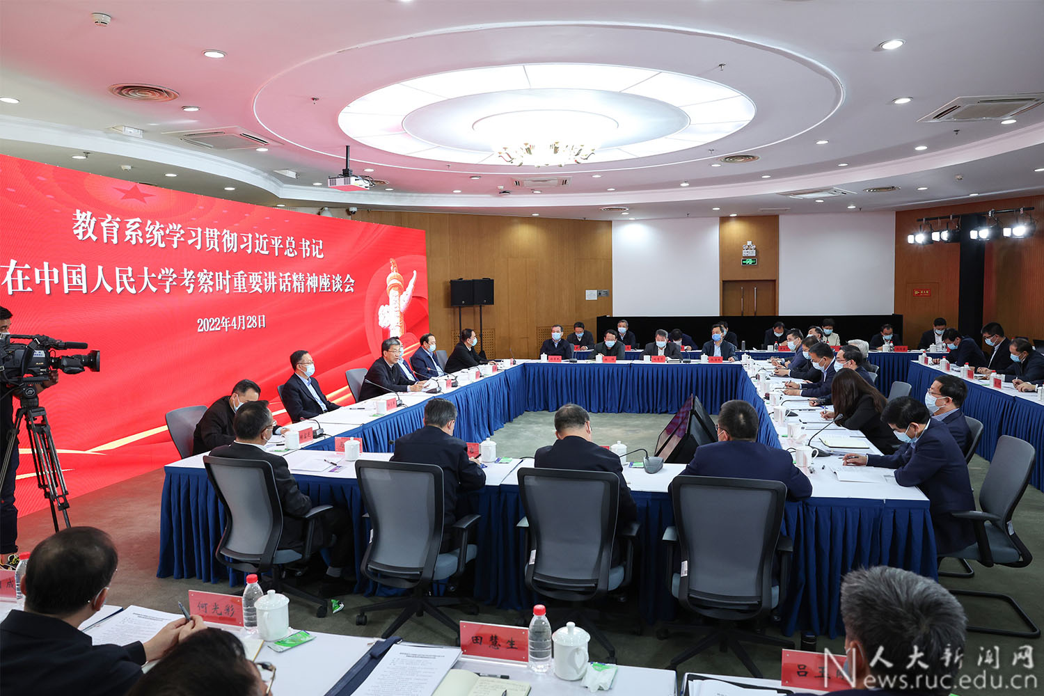 4月28日,教育部在中国人民大学召开教育系统学习贯彻习近平总书记在中国人民大学考察时重要讲话精神座谈会,进一步把重要讲话精神有效转化为实际行动和扎扎实实的工作效果。教育部党组书记、部长怀进鹏出席会议并讲话,教育部党组成员、副部长田学军主持会议,教育部党组成员、中央纪委国家监委驻教育部纪检监察组组长吴道槐,教育部党组成员、副部长郑富芝、宋德民出席会议。