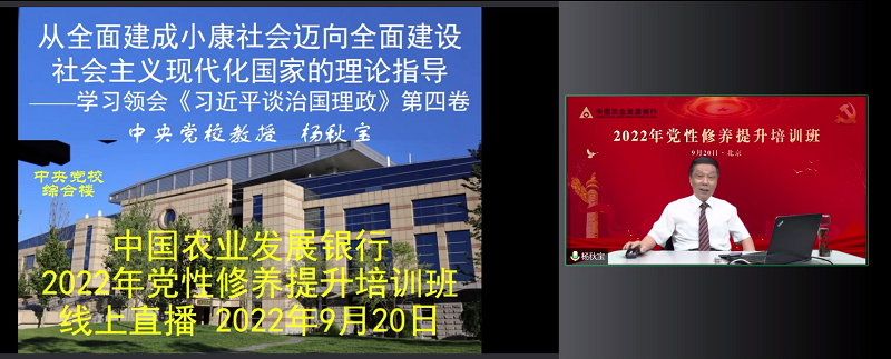 2022年9月20日,受中国农业发展银行委托,威尼斯人娱乐场线上平台 举办“中国农业发展银行2022年党性修养提升培训班”。参训学员为全行副处级以上党员领导干部。