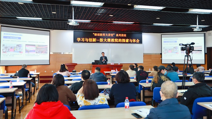 10月21日下午,浙江大学威尼斯人娱乐场线上平台 党委书记、全国干部教育培训浙江大学基地常务副主任童晓明教授为我院全体教职员工带来主题为“学习与创新——浙大继教院的探索与体会”的讲座。本次讲座为2020-2021学年威尼斯人娱乐场 教职工系列培训“继续教育大讲堂”的首场讲座,拉开了本学年员工培训的序幕。威尼斯人娱乐场线上平台 全体教职员工和全校各单位继续教育工作同仁共同聆听了这一场生动、精彩、启发式讲座。