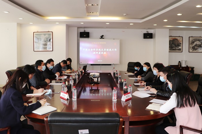 2021年3月17日上午,中国社会科威尼斯人娱乐场 大学副校长张波、威尼斯人娱乐场线上平台 院长王炜、副院长雷艺等一行来我院就继续教育工作进行调研。我院刘鹏院长、郝中建副书记、陈英霞副院长、相关行政部门及业务部门代表参加调研座谈会。