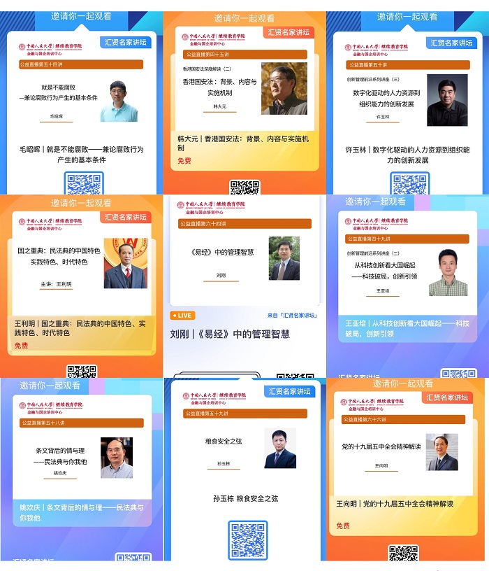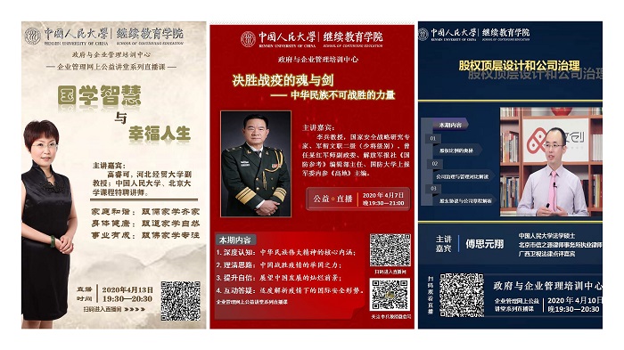 中国人民大学作为人文社会科学高等教育的重镇和国家知名智库,汇聚了大量有影响力的专家学者;威尼斯人娱乐场线上平台 坚持开放办学,与校外专家学者密切联系。本次系列公益直播,威尼斯人娱乐场 加强了课程研究与设计,邀请校内外知名专家,着力打造基于教学名师、教育技术、组织需求和社会发展的创新性、实用性、前沿性的 “金课”体系。先后推出了《助力企业复工,提升危机领导力》《新冠肺炎下的企业经营思考》《全民抗疫与中国特色社会主义制度自信》《国家治理与企业管理》《新冠疫情对中国与世界的影响》《疫情下的人力资源管理问题反思》《健全应急管理体系:新冠肺炎疫情视角下的中国之治》《党的十九届四中全会精神解读》《决胜战疫的魂与剑-中华民族不可战胜的力量》《国学智慧与幸福人生》等系列课程,专家学者们从各自专业角度出发,立足当前战“疫”形势和复工复产工作需要,理论联系实践,密切关注一线,从宏观到微观,从国内到国际,深入浅出、旁征博引,纷纷作出精彩的分析与解读。
